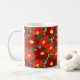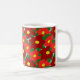 This mug has a Christmas design of larger poinsettias clustered together on a field of light blue.