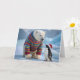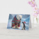 A polar bear wearing an ugly Christmas sweater is seen looking at a cute penguin wearing a Santa Claus hat, standing together on a beautiful Arctic glacier.