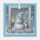In a light grey Portrait framing a very well shaped Snowman in a Blizzard wearing a Grey Toboggan and Scarf as Two Deer and Two White Turtle Doves look on,all surrounded by Multi Coloured floating transparent Bubbles.