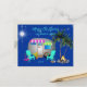 Camping themed, Christmas postcard greeting. A little silver camper is the design on easy to customise postcards. Palm trees are decorated with lights and two turquoise blue chairs are set up by the campfire, while stars shine in the sky. Flamingos and a seashell complete the tropical design. Include a mailing address on the back if you wish. Each postcard will need to be customised separately for addresses. Once a card has been added to your cart, click on it to go back to the product page and customise the next one.