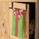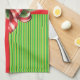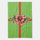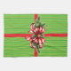 A green and gold striped background, bright red bands, and a beautiful red and white bow with evergreen sprigs dresses this kitchen towel up like a Christmas present. Cute, fun, festive, and perfect for your holiday home!