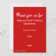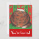 A happy tortoiseshell cat (resembling a christmas pudding!) sits on a green cushion against a red and green holly leaf patterned background. Invitation with a red, green and white customisable design for you to personalise with your own text, images and ideas. An original coloured pencil drawing by Jess Perry.