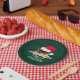 Cute little custom designed pug dog in Santa hat.on a light patterned background.