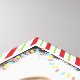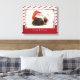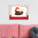 A canvas print with an adorable photo of a pug puppy sleeping while wearing a santa hat. Merry Christmas is written on the band of his hat, in a trendy handwritten font. A grunge border with colourful Christmas lights surround the frame of this cute photo. The background is a festive candy cane striped pattern in red white and green. Customisable text says: Love and Pugs.