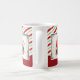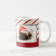 A coffee mug with an adorable photo of a pug puppy sleeping while wearing a santa hat. Merry Christmas is written on the band of his hat, in a trendy handwritten font. A grunge border with colourful Christmas lights surround the frame of this cute photo. The background is a festive candy cane striped pattern in red white and green.