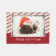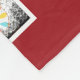 A blanket with an adorable photo of a pug puppy sleeping while wearing a santa hat. Merry Christmas is written on the band of his hat, in a trendy handwritten font. A grunge border with colourful Christmas lights surround the frame of this cute photo. The background is a festive candy cane striped pattern in red white and green. Customisable text at the bottom says: Peace Joy and Pugs.