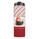 A thernal tumbler with an adorable photo of a pug puppy sleeping while wearing a santa hat. Merry Christmas is written on the band of his hat, in a trendy handwritten font. A grunge border with colourful Christmas lights surround the frame of this cute photo. The background is a festive candy cane striped pattern in red white and green. Customisable text at the bottom says: Peace Joy and Pugs.