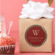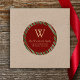 This elegant return address sticker features a burgundy red circle on a quatrefoil pattern background in burgundy, green and gold. Personalise the design with your monogram initial and family name in gold serif font, with your address below in sans serif.