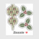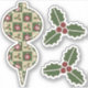 Four squares in green and tan are adorned with red ornaments decorated with white snowflakes and green holly with red berries. White stitching adds a decorative touch, giving the repeating pattern the appearance of a quilt, creating a perfectly cosy feeling for the Christmas holiday. The shape of a teardrop ornament creates a mask for the design to add a final seasonal touch.