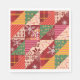 Patchwork design of holiday prints. Dancing candy canes, hanging ornaments, and falling snowflakes come together in a fun bright cheater quilt pattern.