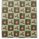 Four squares in green and tan are adorned with red ornaments decorated with white snowflakes and green holly with red berries. White stitching adds a decorative touch, giving the repeating pattern the appearance of a quilt, creating a perfectly cosy feeling for the Christmas holiday.