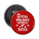 Quote: Official Holiday Spirits Taster. Red background, white text. Decorated with glasses of wine, Santa's hat, coctail glass and snow crystals,