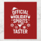 Quote: Official Holiday Spirits Taster.  Red background, white text. Decorated with glasses of wine, Santa's hat, coctail glass and snow crystals,
