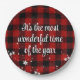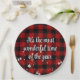 Holiday text on red and black buffalo plaid. with snowflakes.