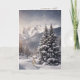 Snow-covered pine trees and mountain peaks with snowflakes and a cute bunny.