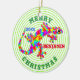 A big smiling rainbow covered salamander is perfectly fun for little boy’s custom keepsake Christmas ornament that will be treasured for years. Merry Christmas greeting text has giggly eyeballs on top. Background or green concentric circles adds the perfect touch. Child’s name and year on front may be personalised. The back of ornament has two salamanders with text that may be customised however you wish. Enjoy a browse through other keepsake Christmas ornaments in my store on the Zazzle site.