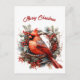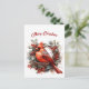 The image depicts an Illustration of a red cardinal surrounded by holly leaves, red berries, pine needles, and pine cones.