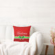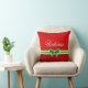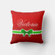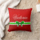 Beautiful festive red throw pillow with green bow and personalised text.