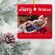 White text: Merry Christmas, written with a trendy style script. Personalise and use your own photo and names. A classic red background.
