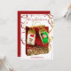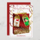 Cute red and gold gift bag with name tags photo placements. ‘Merry Christmas” script with your name in simple typography. Strands of red and gold ribbons streaming down over the gift bag. So festive.