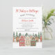 Sweet Christmas theme it takes a village baby shower themed baby shower invitation featuring a village and pine tree forest. This Christmas village theme baby shower invitation also features some snow.