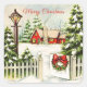 Cute red cottage set behind a white picket fence, decorated with a Christmas wreath with red bow. Lantern glows a bright yellow as a welcoming sign to family and friends for the holidays.