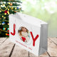 A modern minimalist Christmas gift bag in red and white. A white background, with the word JOY written with red bold letters. The letter O is used as a photo frame. Personalise and add your own family photo, name and year.