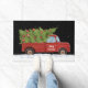 Retro red truck with Merry Christmas text and a green Christmas tree.