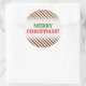 This round Christmas sticker design features a pattern of red, white and green stripes. These are colours commonly associated with Christmas. It also features the warm greeting, "MERRY CHRISTMAS!", in red and green coloured text. [~Z0000114]