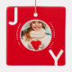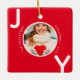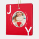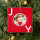 A modern minimalist Christmas ornament in red and white. A classic red background, with the word JOY written with white bold letters. The letter O is used as a photo frame. Personalize and add your own family photo, name and year.