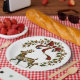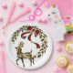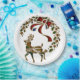 An elegant Christmas paper plate featuring a golden reindeer with a colourful trail of gold stars, red bow and green holly in the shape of a Christmas wreath. This Christmas paper plate will add a touch of flair and style to your Christmas entertaining and dining during the holiday season.