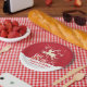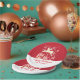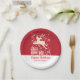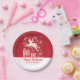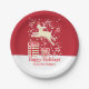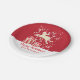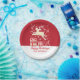 Cute prancing reindeer jumping over Christmas presents with snow and stars, graphic Christmas paper plates in shades of bright red, maroon red, yellow cream and white. Personalise with your own family name or greeting. Ideal for Christmas parties.
