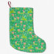 Cute Christmas graphic patterned stocking featuring prancing reindeer and singing birds with gifts. A fun Holiday stocking in warm red, white and green hues.