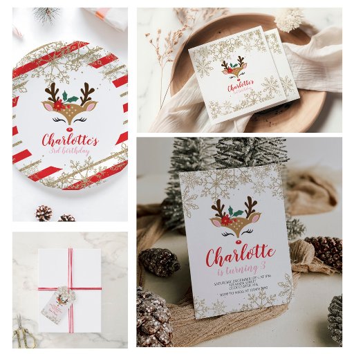 Christmas Reindeer girl birthday party stickers with cute reindeer face and Gold Snowflakes and Red and Gold Glitter Stripes.