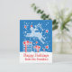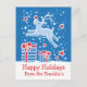 Share the fun of the Happy holiday season with this fun Christmas reindeer prancing over Christmas gifts postcard. Original graphic art by Sarah Trett for www.mylittleeden.com
