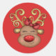 A gorgeous illustration of the head of a cartoon reindeer wearing a red glitter bow in her horns has a vibrant faux red glitter nose and faux gold glitter horns. She is set against a red background that makes her pop. These are ideal to use to add a touch of class to your Christmas gifts.