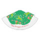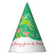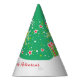 Cute winter holiday seasonal prancing reindeer personalised party hat. Perfect in festive shades of green, red and white. © Unique graphics prancing reindeer jumping over gifts original drawing and graphic design by Sarah Trett www.sarahtrett.com for www.mylittleeden.com on zazzle.