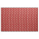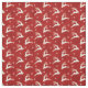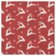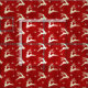 Christmas, gold, reindeer leaping pattern with white snowflakes and bare trees in red background.