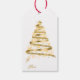 This holiday gift tag is shown in a festive Christmas ribbon tree print.