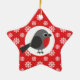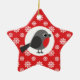 This Christmas ceramic ornament depicts a robin surrounded by a pattern of snowflakes on a red background. It is a nice addition to your Christmas decors.