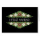 A chic, floral Christmas Card with swags of red and white Christmas Roses, Holly and Ivy on a black background and the Spanish Language Greeting 'i Feliz Navidad' in stylish, modern lettering, in white. From a hand-painted design by Judy Adamson. Please feel free to add your own inside text.