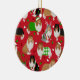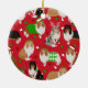 Cute Rough Collie dogs dressed in festive holiday outfits, Santa hats and argyle sweaters with scattered Christmas ornaments.