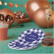 Set of paper plates with a blue and white rustic farmhouse checks pattern and black and white Merry Christmas print in the centre.