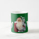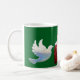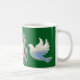 White doves surround Santa Claus on this Christmas mug. Green background.