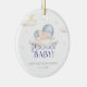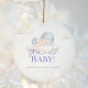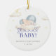 The "Santa Baby" shower ceramic ornament has a sweet, festive design, featuring a baby in a blue Santa hat with soft clouds and stars. It uses playful red script and pastel tones, creating a cosy holiday feel, perfect for a winter baby shower.