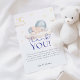 The "Santa Baby" shower thank you card has a sweet, festive design, featuring a baby in a blue Santa hat with soft clouds and stars. It uses playful red script and pastel tones, creating a cosy holiday feel, perfect for a winter baby shower.