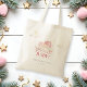The "Santa Baby" shower tote bag has a sweet, festive design, featuring a baby in a pink Santa hat with soft clouds and stars. It uses playful red script and pastel tones, creating a cosy holiday feel, perfect for a winter baby shower.
