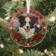 Here's a pretty glass ornament with a stained glass theme, featuring a brown and white Border Collie dog dressed in his Santa Claus hat. The dog peeks out of a pretty green holly and red berry half wreath. This ornament makes a nice stocking stuffer or decoration for anyone who loves a Collie.