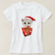 Cute Kitten Santa with big blue Eyes holding a Big Red Christmas Gift