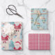 Set of 3 Christmas Wrapping Paper Sheets. One has a tan and pink diamond argyle pattern in the background and a pattern of Santa Claus,  Christmas trees and Christmas stockings. Another is red gingham check and the third is blue with antique Victorian style ornaments.